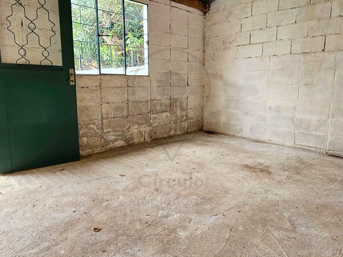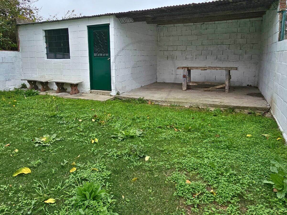 Amplio fondo verde, galpón cerrado con rejas y leñero semi cerrado.